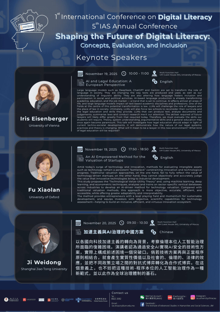 The Institute of Advanced Studies in Humanities and Social Sciences (IAS) of the University of Macau cordially invites you to participate in the “1st International Conference” on Digital Literacy and the “5th Annual Conference” on Shaping the Future of Digital Literacy: Concepts, Evaluation, and Inclusion from November 19 to 20, 2025.